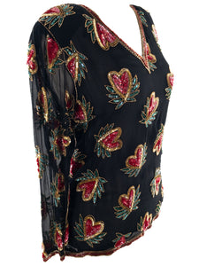 Megere Black Red Sequin Silk Long Sleeve Size M Blouse